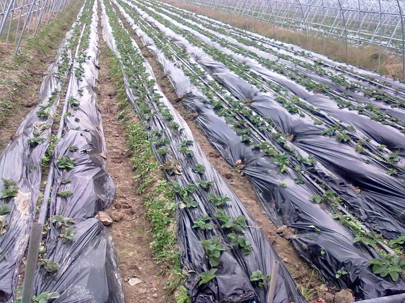 五、减轻杂草生长。采用透明膜覆盖时草害是个严重问题,改用农用黑地膜覆盖后,地面杂草因光照条件不足而难以生长,测定表明,覆盖透光率为5%的黑膜后,一个月后土壤几乎不见杂草。使用透光率10%的农用黑地膜覆盖时,土壤虽生出杂草,但生长力很弱,不会成灾。